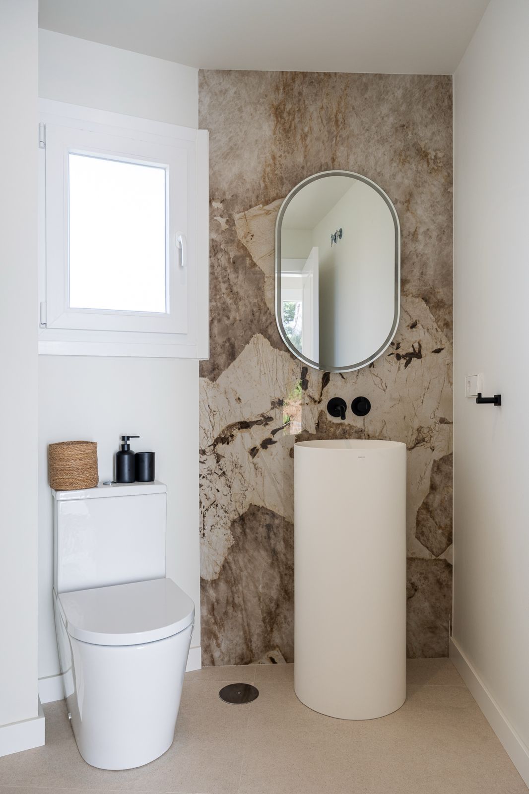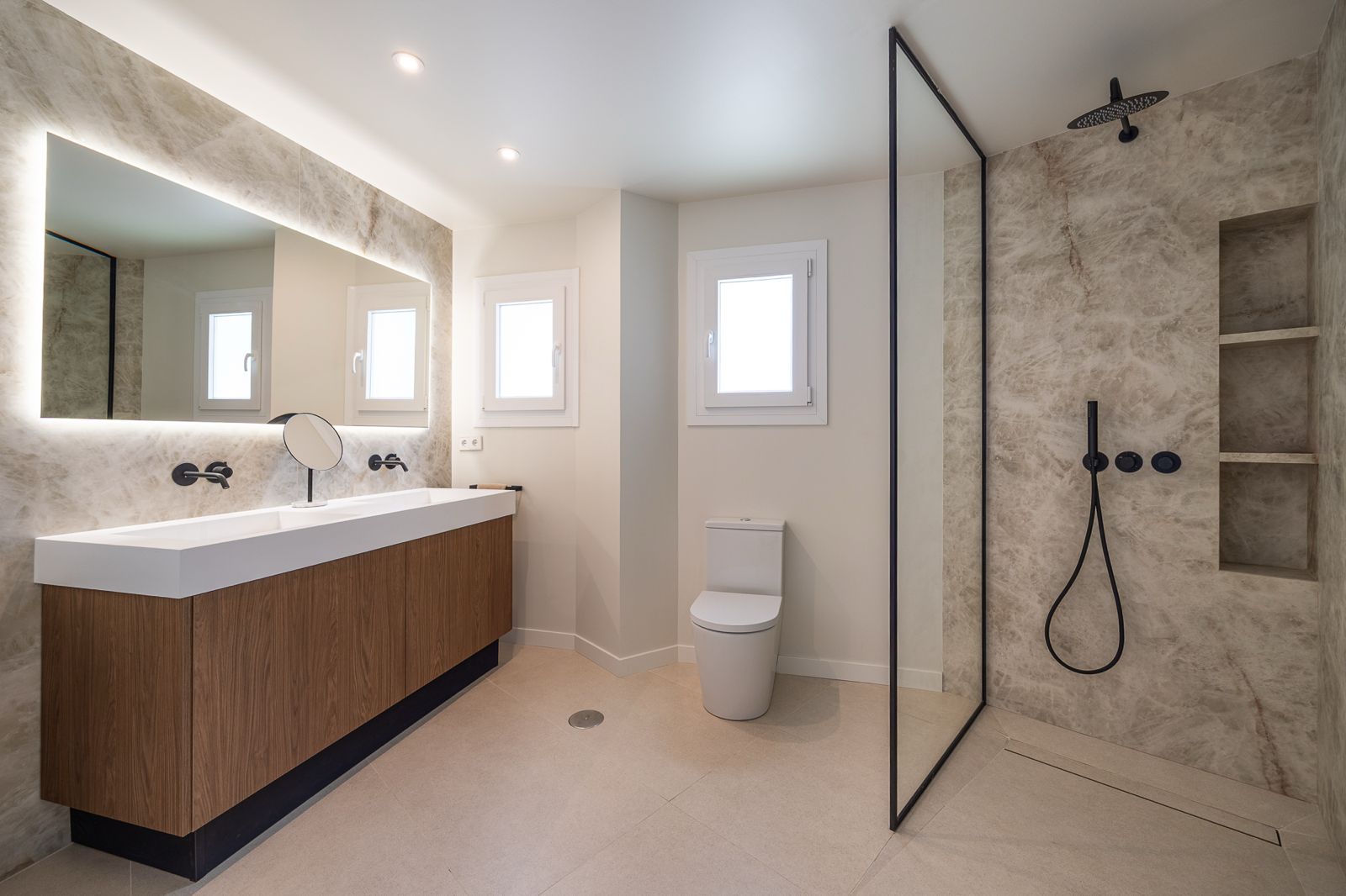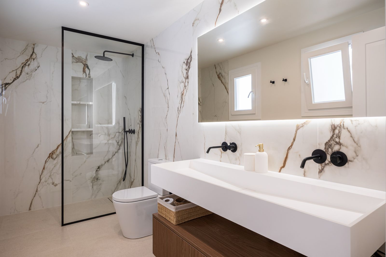 - Baños de diseño vanguardista, donde el mármol y las tonalidades neutras se fusionan con griferías negras de carácter minimalista, creando espacios elegantes y atemporales.